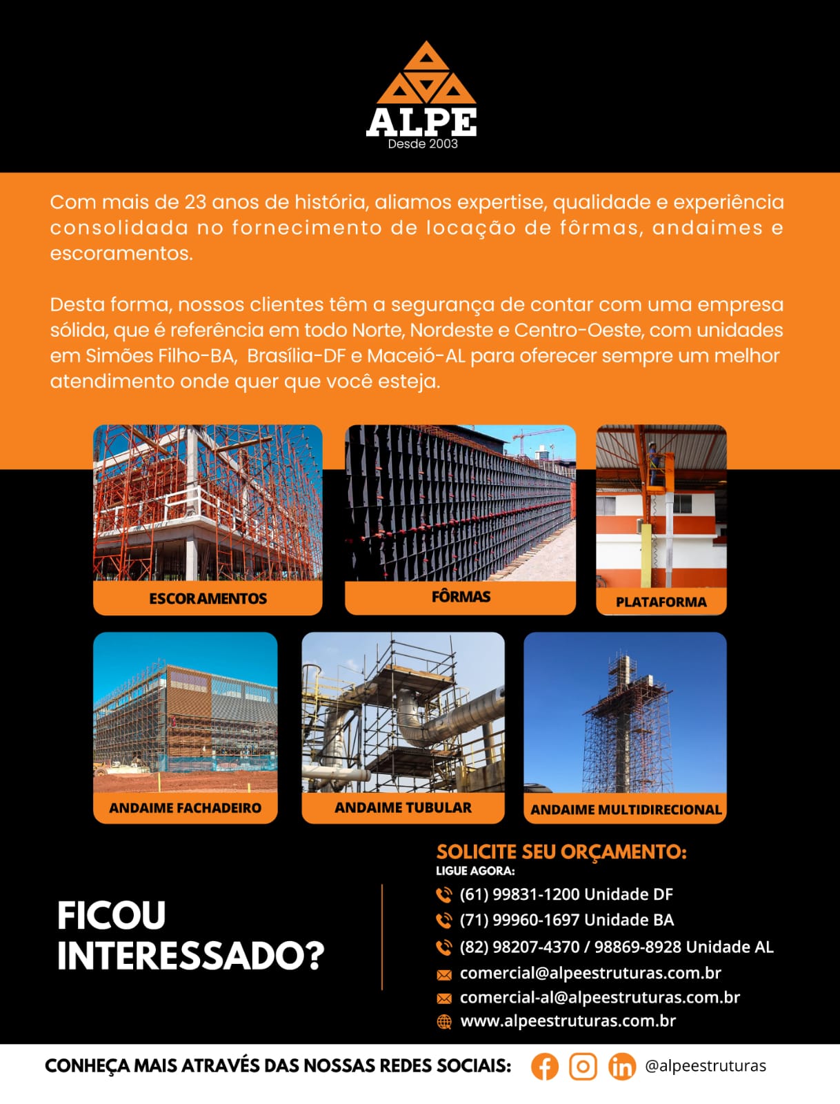 A ALPE é fruto da visão empreendedora de seu fundador, que trilhou um caminho de determinação, coragem e trabalho árduo. Esses valores permitiram que a empresa se tornasse líder em locações de fôrmas, andaimes e escoramentos nos mercados do Nordeste e Centro-Oeste, oferecendo excelência na qualidade de seus serviços.